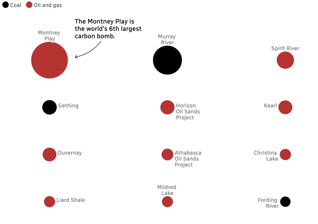 加拿大最大的碳排放炸弹——也是世界第六大碳排放炸弹——是Montney Play。天然气,其主要成分甲烷,是通过水力压裂提取的,这是一种水密集型过程,能够将甲烷排放到大气中。