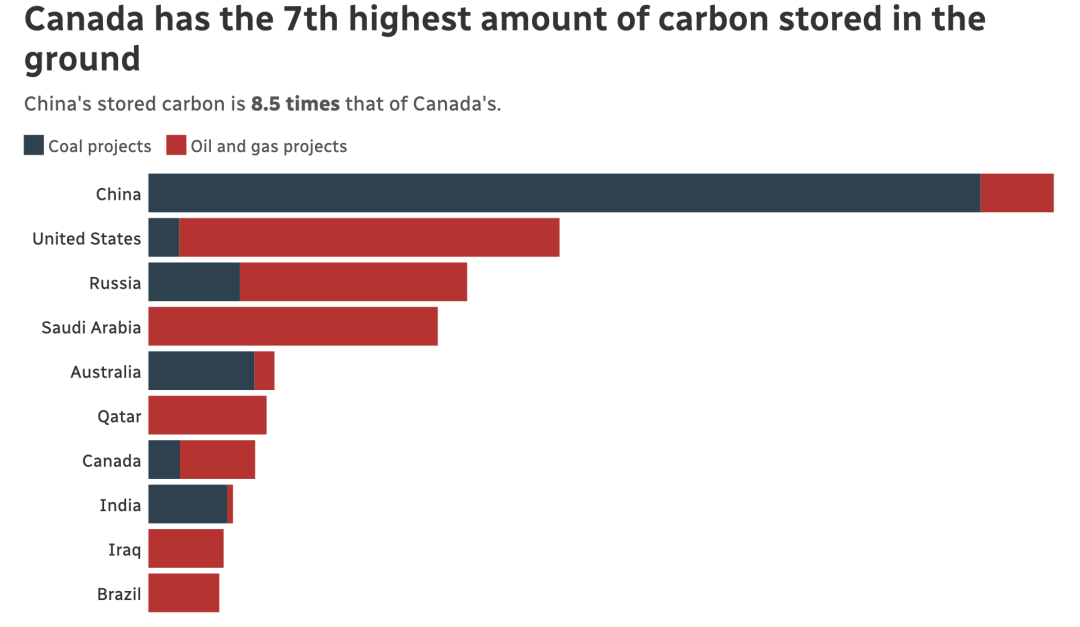 加拿大政府只报告加拿大本土排放的二氧化碳量。而他们的碳排放数据并不会将这些化石燃料出口和在其他国家燃烧时产生的温室气体排放量计算在内。Levin说,这个数据计算方法让一些像加拿大这样的大型石油和天然气生产国,完全放弃了对从地下开采出的石油和天然气的气候责任。她说,为了防止全球气温灾难性上升,加拿大需要“在2034年之前结束生产石油和天然气”。