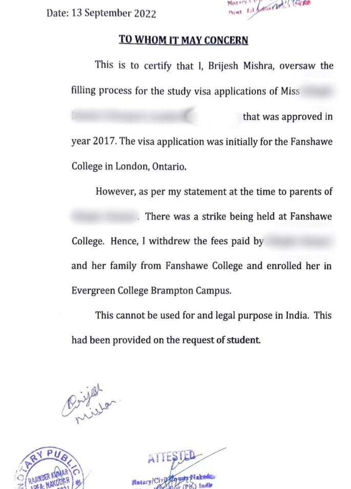 《第五频道》节目于2022年9月获得了一封由Mishra签署的信,信中指出,Mishra取走了该学生和她家人支付给在安省伦敦市的Fanshawe College的学费,随后将她转学到一个不知名的学校Evergreen College。