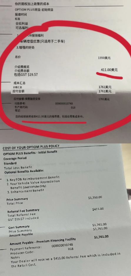 一堆英文合同让小A看花了眼,等回到家拿翻译软件一比对,才发现这种附加险的收费单据上400刀的推荐费(Referral Fee)。按小A的理解,这是保险公司给车行老板的好处费,幸亏她还没签,好家伙,差点儿被人坑了!