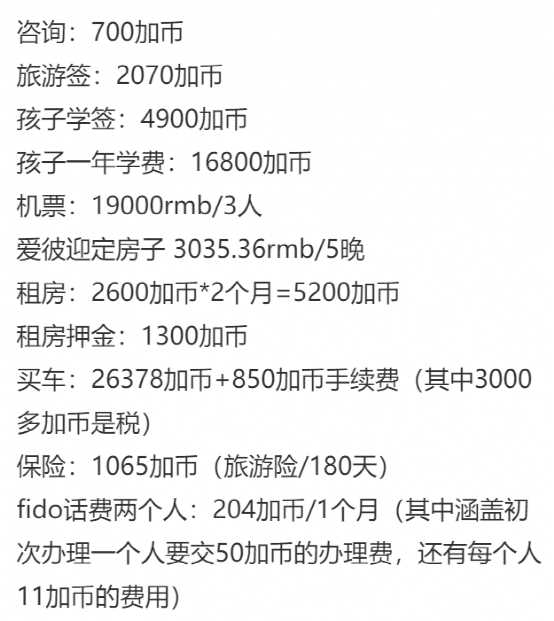 做出决定后,一切似乎没那么令人焦虑了。不过,小A一算账,这一次加拿大之行的花销还是让人瞠目结舌。加上卖车抵扣了一些开销,一个多月小A一家总共花费了23.1万的人民币。