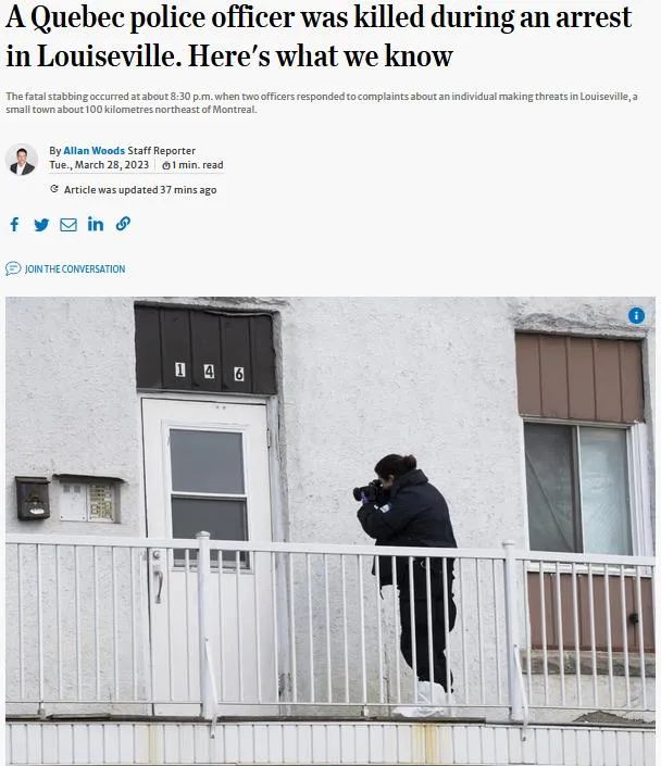 魁省 Louiseville 市女警在处理骚扰事件时,遭歹徒持刀刺杀身亡。