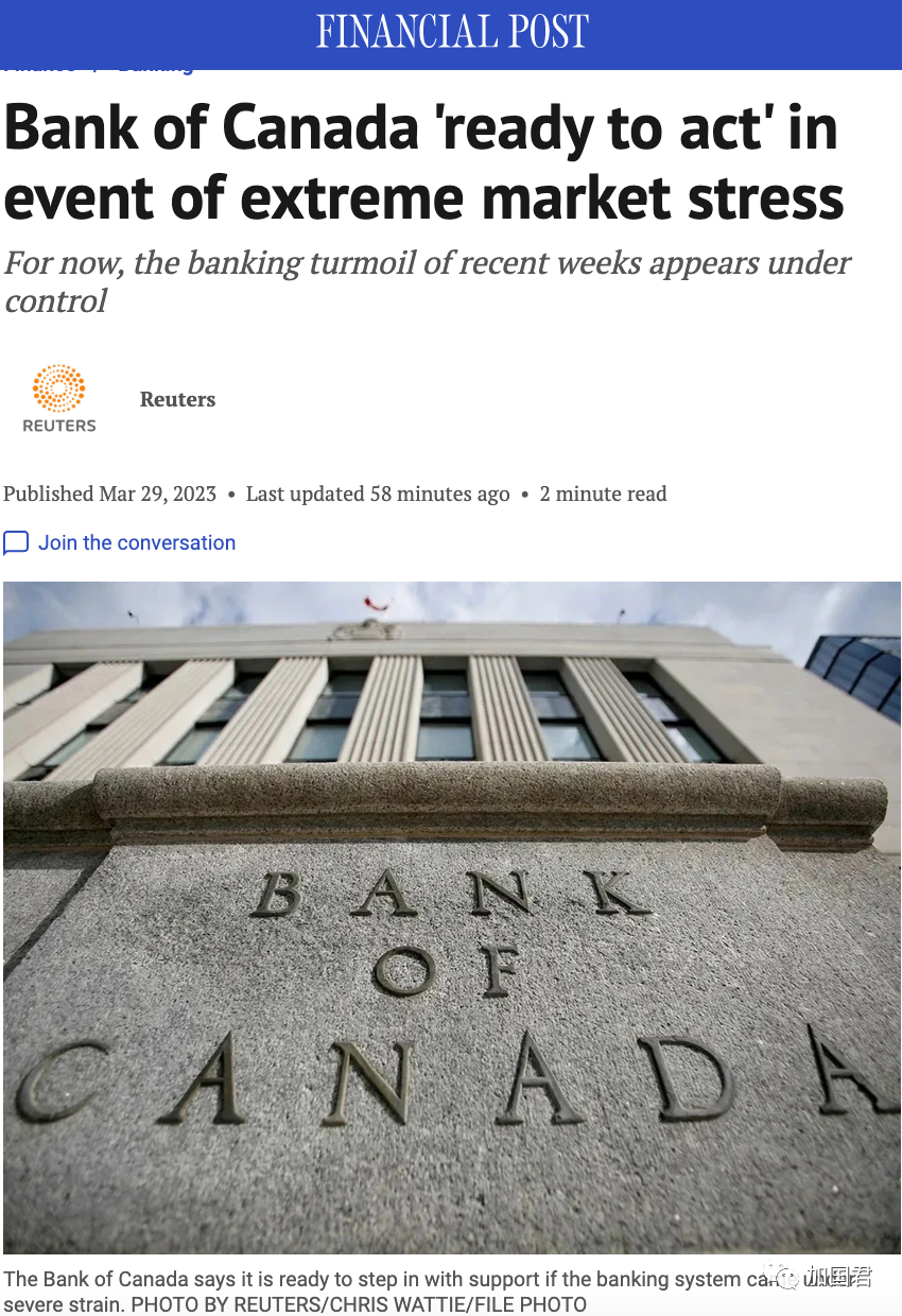 这是加拿大央行首次就美国和欧洲的银行业动荡发表评论。
