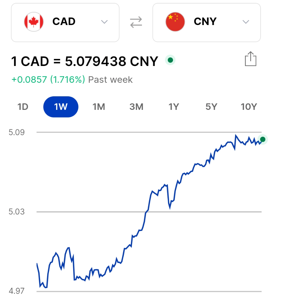 加元兑人民币直冲¥5.10,同样是近一个月高位。