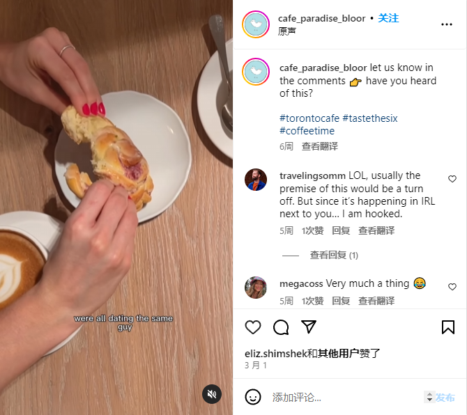 Bloor Street West的Cafe Paradise最近发布了一段Instagram视频,一位顾客说她坐在“一个正在同时与三个女孩约会的人”的旁边,这是她通过Facebook群组发现的。