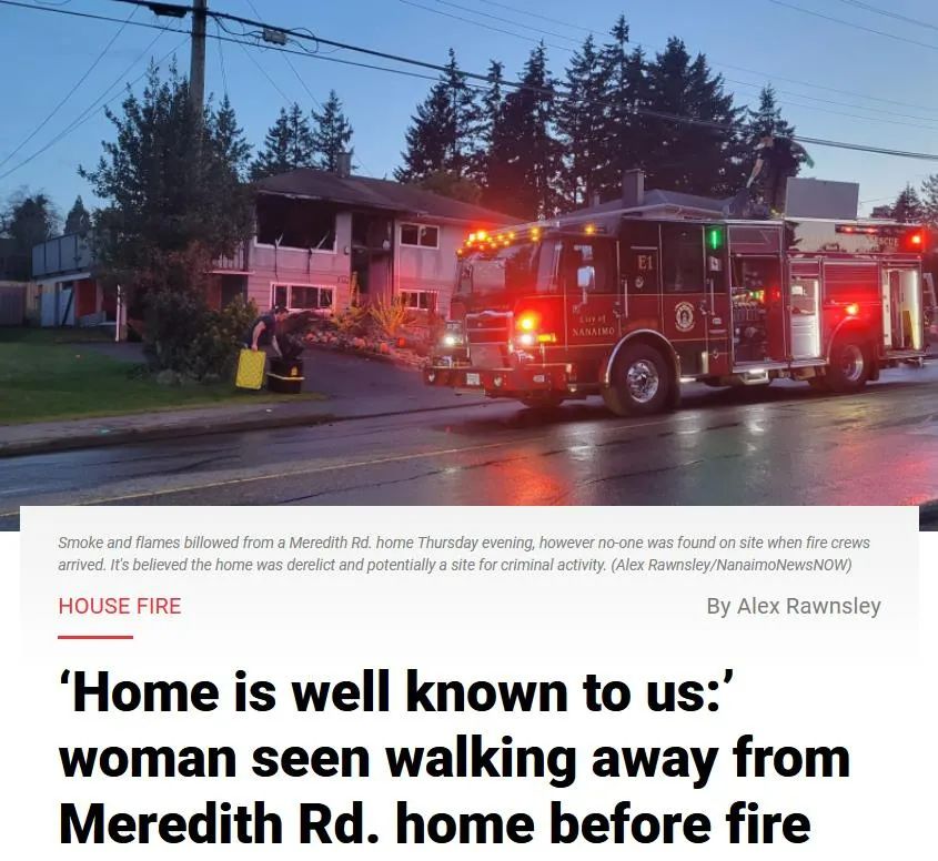 据Nanaimo News Now报道,火警发生在下午6:15左右,消防人员接报指Meredith Rd 1600 号路段一栋房屋起火,这栋房屋靠近Nanaimo Regional General Hospital,消防局不敢大意,派出了 21 名消防员前往灌救。