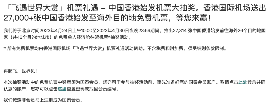 筹备已久的香港机票0元送【飞遇世界大赏】活动终于开始了。国泰官网宣布,将于北京时间2023年4月24日上午10:00至2023年4月30日夜晚23:59期间,推出27,314 张从中国香港始发前往海外26个目的地国家(共46个目的地城市)的免费单人经济舱往返机票抽奖活动。