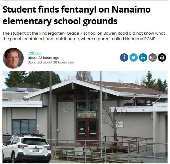 据Times Colonist报道,上周五(4月14日)下午,一个Ecole Quarterway 小学的学生在放学时,于校园内发现一个装有强效阿片类药物芬太尼的小袋,很好奇,就将小袋子带回家。