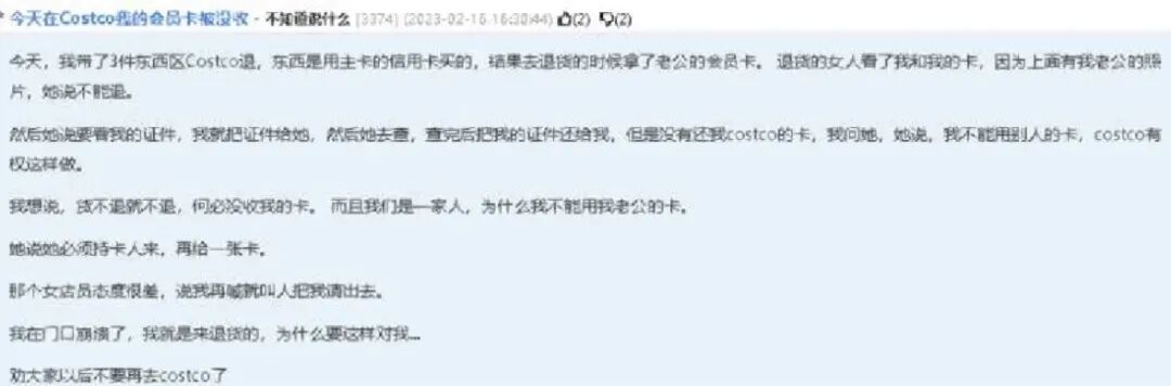 无独有偶,有位华人网友也在论坛发帖称,她带了3件商品去Costco退货,因为东西是她先生的信用卡买的,所以退货也带了先生的信用卡。没想到不但被Costco拒绝,而且还注销了她先生的会员卡。理由是“不能使用他人的会员卡”。