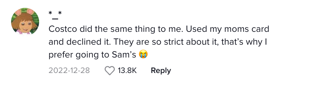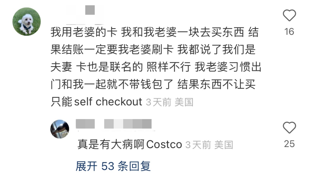 很多网友称自己也有类似的经历。有人说,“Costco对我做了同样的事情。我用了我妈妈的卡,他们拒绝了,他们对此非常严格。这就是为什么我更喜欢去 Sam’s。”