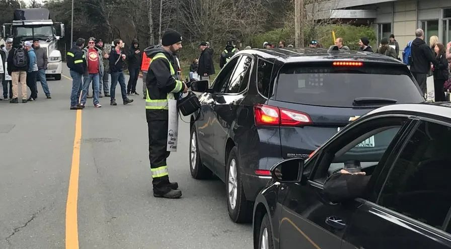 目前尚不清楚温哥华岛上共有多少公务员参与罢工,但 Esquimalt 的交通因罢工者举着 PSAC 标语牌沿着 Admirals Road 行进而受阻。