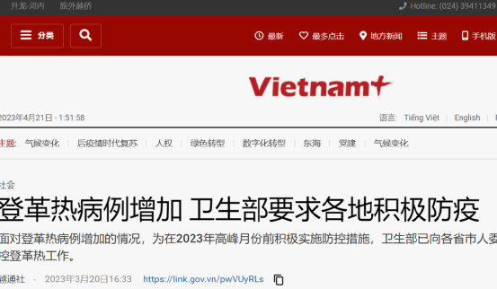 另越南卫生部统计,2023年前两个月,越南累计报告11991例登革热疑似病例,较2022年同期(5507例)增长118%。