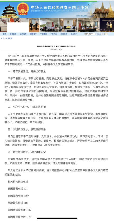 中国驻泰国大使馆4月11日发布重要提醒称,当前疫情尚未结束,请在泰中国留学人员继续做好个人防护,同时注意防范登革热和疟疾。如出现发烧、咳嗽、肌肉酸痛等症状,请及时前往医院就医。