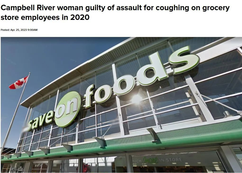 一个住在坎贝尔河(Campbell River)的女子,2020年因新冠肺炎(COVID-19)疫情的封锁措施,对着执行封锁政策的超市店员咳嗽,日前被法庭裁定袭击罪成。