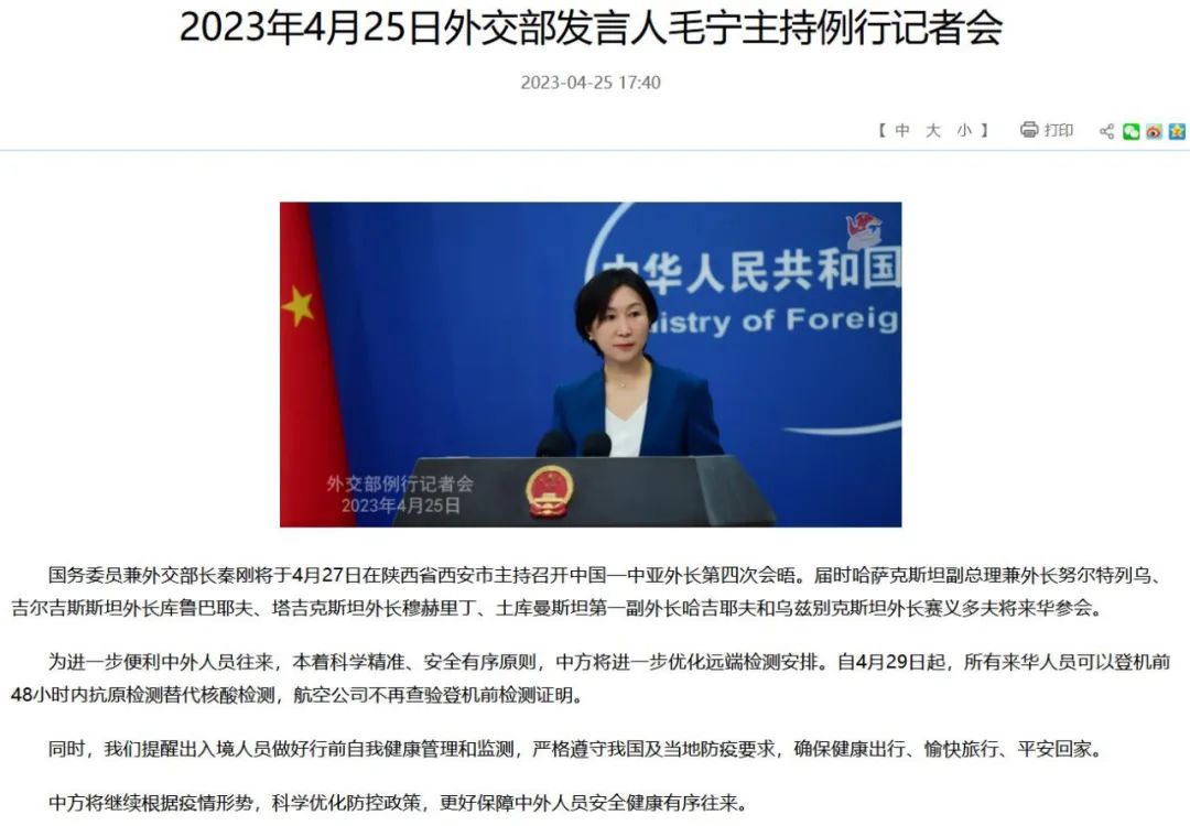 毛宁表示:“自 4 月 29 日起,所有来华人员可以登机前48小时内抗原检测代替核酸检测,航空公司不再查验登机前检测证明。”