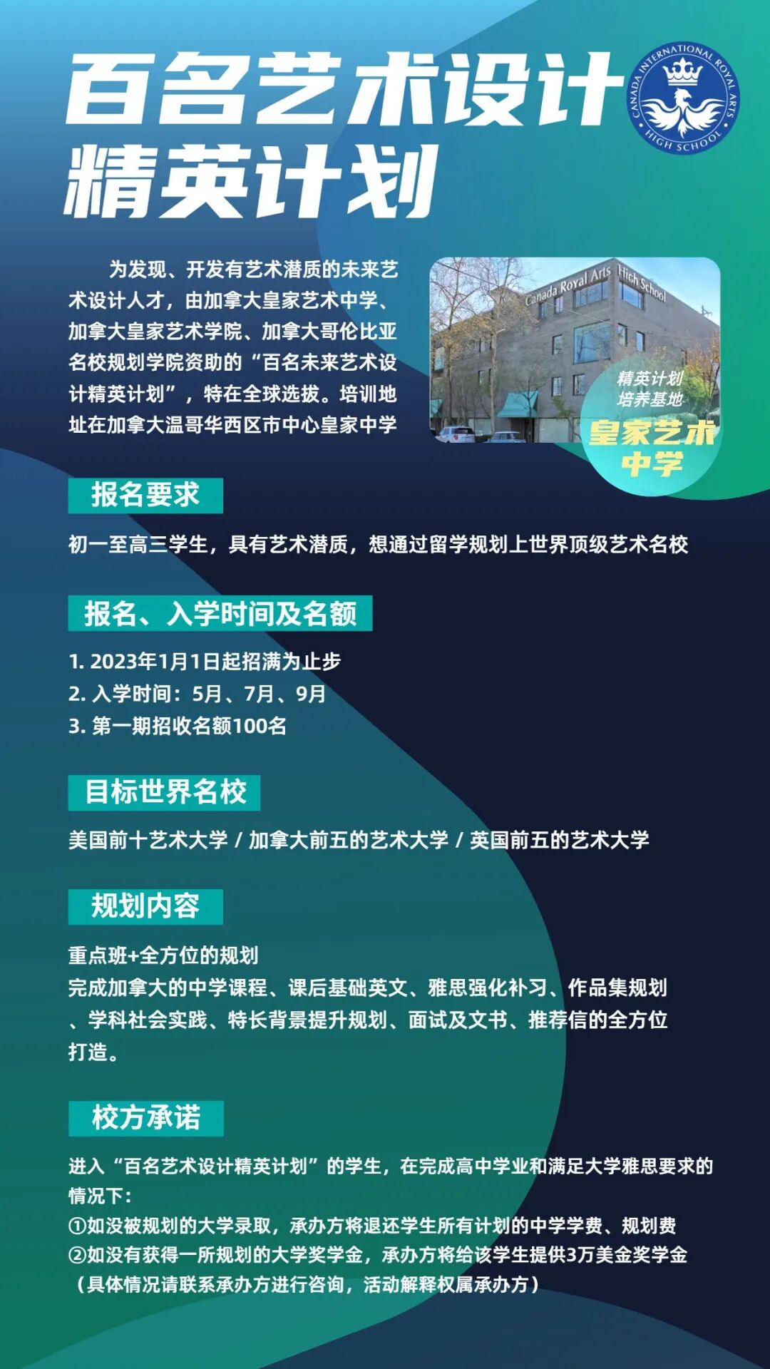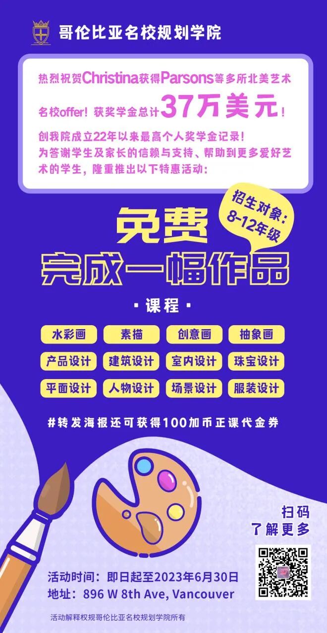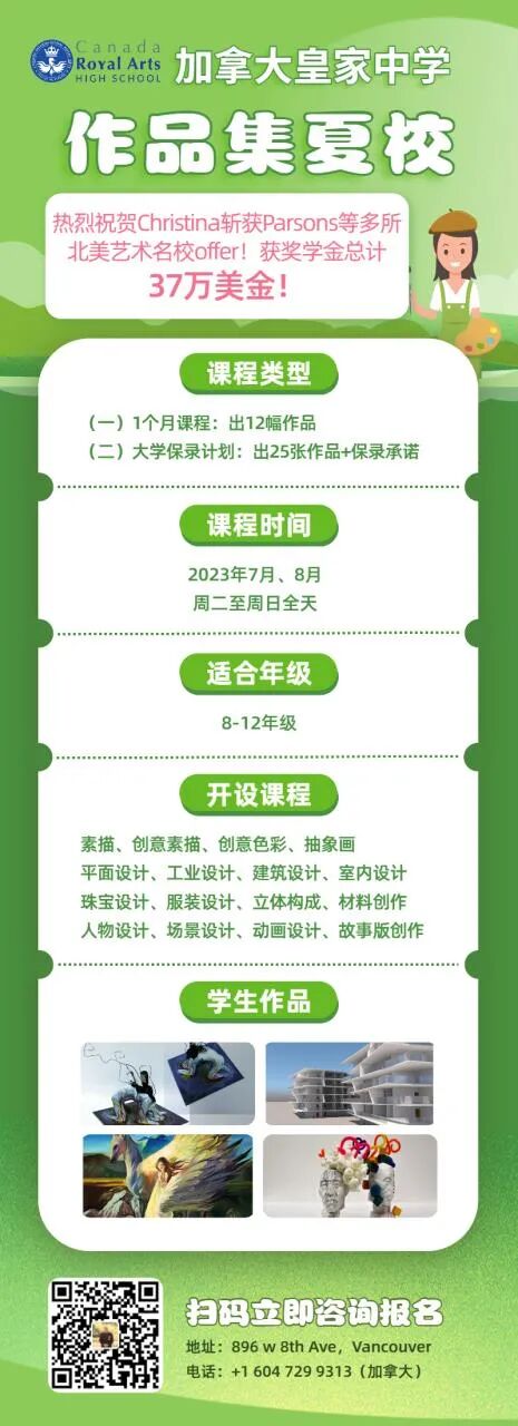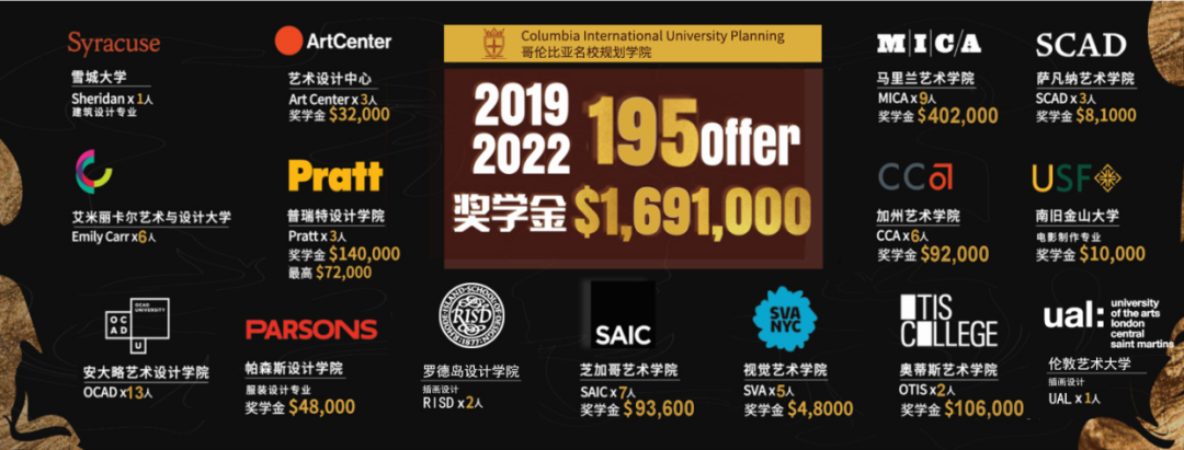 20多年来,帮助上千名孩子上世界名校,累计奖学金1000多万美金。今年规划的学生都被美国罗德岛艺术设计大学,柏森斯艺术学院等及加拿大的UBC大学,多伦大学.安达略艺术设计大学爱米丽卡艺术大学等世界名校录取。获奖学金比例在90%以上。