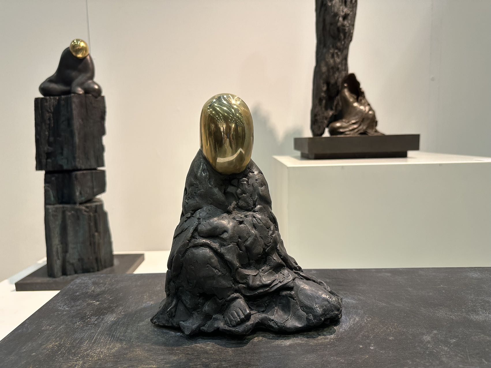 本色画廊艺术家Gao Feng的雕塑作品却独有一种静穆的美。展出的三件人像雕塑依中国画构图摆放,人物形态安详, 身上光滑的表面与石材、木质的粗糙肌理形成对比美,而人像头部的金属材质能让观者通过作品形成自我观照,仿佛能跟与其对话一样。