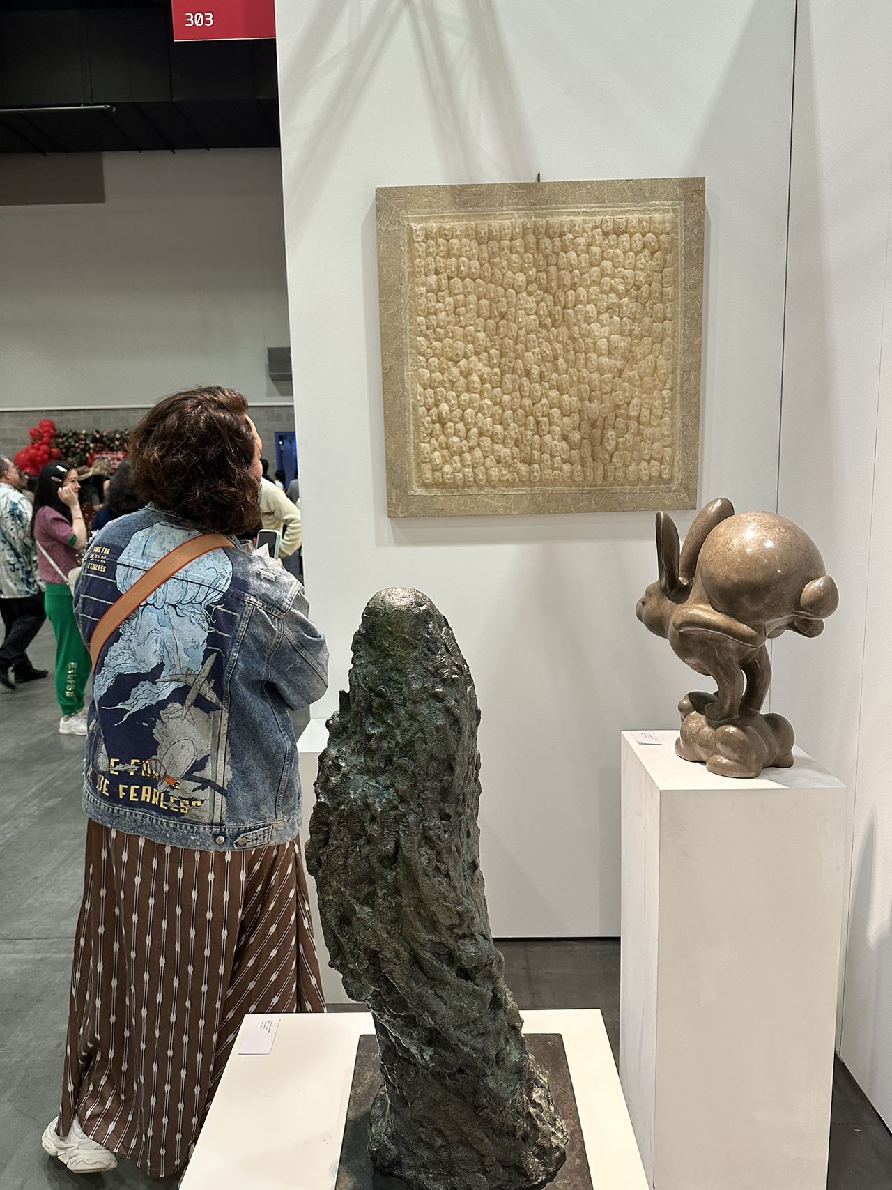 墙上的这个雕塑作品意喻“众生相”,静静地诠释作者内心的东方情怀。