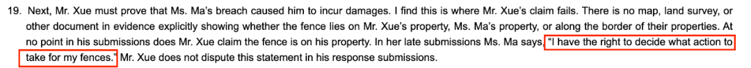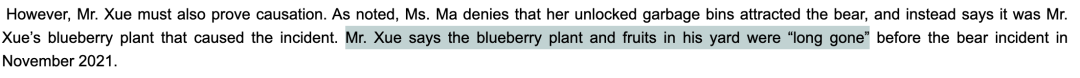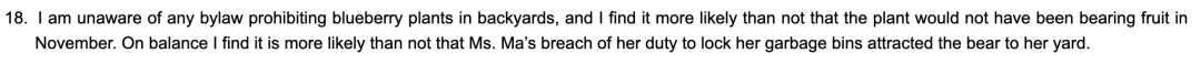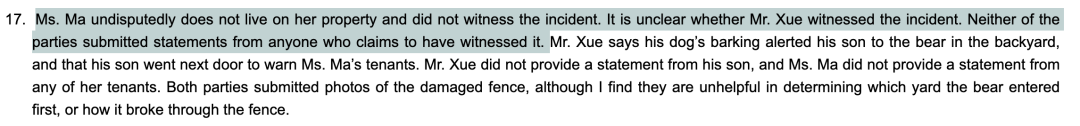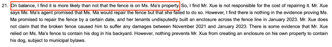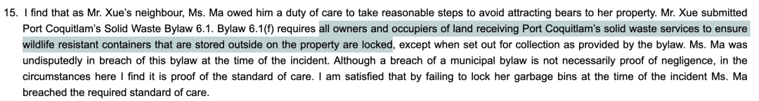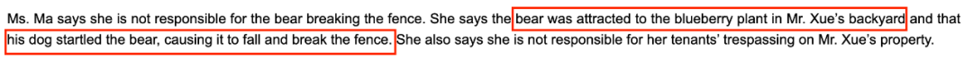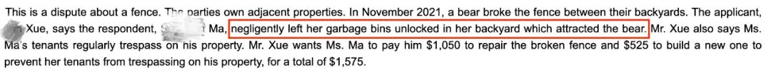熊撞烂后院围栏!加拿大俩华人邻居却闹上法庭,都指责是对方责任…2023-05-05 |作者:超级生活 | 来源:温哥华头条加拿大华人温哥华头条Loading...分享:#加拿大#华人最近,加拿大BC省的民事仲裁庭(Civil Resolution Tribunal,简称CRT)解决了一件发生在高贵林港(Port Coquitlam)的邻居间纠纷案。 该案件发生在2021年11月,一天,一只熊撞毁了两位华人邻居之间的围栏。两人为究竟是谁引来的熊的原因争执不清,纷纷指责是对方的责任。 根据法庭文件显示,事件的主人公分别为X先生和M女士。 在法庭上,X先生表示是因为M女士忘了将后院的垃圾桶上锁,才招惹来了熊。X先生还说,他看到M女士的房客经常闯入自家的地盘,所以X先生要求M女士除了支付$1050加元用于修复破损的围栏外,还要另外支付$525加元建造新的围栏,用于防止M女士房客非法闯入(trespassing)自家区域,总计赔偿$1,575加元。 然而,M女士却不同意,认为是X先生后院种植的蓝莓吸引来了熊,而X先生家的狗惊吓了熊,导致熊摔倒,撞坏了围栏。M女士补充道,她不会为自家房客非法闯入X先生后院的事情负责。 本次纠纷的焦点在于: M女士是否需要支付X先生$1050的围栏修补费?(究竟是谁引来的熊) M女士是否需要向X先生支付$525加建新的围栏? 一项一项来,首先是否需要支付围栏修补费呢? 根据法庭文件显示,X先生说M女士没有为垃圾桶上锁,违反了市政法规。M女士也承认事发时她的垃圾桶没有上锁,但是她说这并不是引来熊的原因。 M女士表示,在过去的10年里,一直有熊在她的后院游荡,但以前从未破坏过她的围栏。反而是X先生种植的蓝莓引来了熊。 在法庭上,X先生抗辩道,在2021年11月的熊事件之前,他院子里的蓝莓和水果“早就没了”(long gone)。X先生表示自家的狗确实叫了,他的儿子循着狗的叫声发现了后院有熊,他儿子还跑到隔壁警告M女士的房客。 所以事实上,不住在此处的M女士并没有目睹这一事件,法官也不清楚X先生是否亲眼看到了事发时的情况。双方也没有提交目击者的陈述。 而且根据双方提交的损坏的围栏照片,法官也无法判断熊究竟是先进入哪一个院子的,以及如何破坏围栏的。 法官查阅了当地的法规,并没有找到禁止在后院种蓝莓的规定,而且法官认为蓝莓也不会在11月结果。 反而M女士违反了高贵林港的固体废物处理章程(即要求所有使用高贵林港的固体废物服务的土地所有者和占有人确保存放在物业外的容器是处于上锁的状态。),于是法官认定更可能是M女士没锁的垃圾桶将熊引到院子里的。 本以为到此已经厘清了责任关系。 然而法官发现,X先生在提交的材料中从未声称围栏是在他的土地财产上的,M女士在提交的材料中表明“我有权决定对我的围栏采取行动。”X先生也对这一说法没有提出异议。 此外,自从熊的事件发生后,M女士的租户也采取了多次行动来修复破损的地方,拆除了原来的2块围栏板,换上了橙色的网。 因此,法官认为围栏更可能是在M女士的土地财产上的。所以,法官裁定X先生不用对围栏的修理费用负责。其次,有证据表明,X先生还是依靠M女士的围栏将自家的狗关在后院的。 而对于建新围栏的问题,法官认为,没有证据表明M女士指示或允许自己的租客非法闯入X先生的区域,所以也不需要负责。 最终法官裁定X先生的申诉不成功,无权获得CRT费用或与争议相关的费用报销。而作为胜诉方,M女士有权获得与争议相关的合理费用的报销。 M女士申请索赔1200加元,作为她和丈夫往返旧金山和温哥华的机票、酒店、地面交通费用的补偿。 然而法官认为,CRT是一个在线法庭,可以以远程线上的方式进行,而M女士从始至终都没有向CRT表示用远程在线的方式解决是存在困难的,所以才不得不飞来线下解决。因此,法官驳回了M女士的索赔。 最终,因为法官认定围栏更可能属于M女士的,也是M女士没锁垃圾箱吸引熊的可能性更大,所以X先生不用承担维修费用。此外,也没有证据表明,双方还受到了更多经济损失,一宗纠纷最终双方竟都不用向对方支付任何费用。 而在这次纠纷中,值得注意的几点有: 要注意当地社区的法规,避免因疏忽忘锁垃圾箱这类事情引来野生动物,对自己和他人造成经济损失。 在上诉或者提交法庭材料时,要注意要被破坏的物体究竟是属于哪一方的财产。 发生问题时应注意及时留有图片证据。以及提交目击者的陈述。 CRT法庭可以线上远程进行,避免花冤枉钱。 这起纠纷最终就这么收尾了,不知道大家看完都有什么感想呢? 阅读 未经允许不得转载:加拿大乐活网 »熊撞烂后院围栏!加拿大俩华人邻居却闹上法庭,都指责是对方责任…分享: