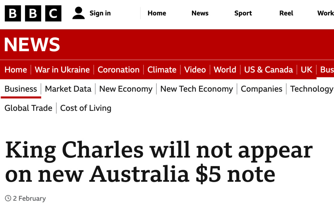 英联邦的另一个成员澳大利亚此前已宣布,新版5澳元纸币不会使用查尔斯三世的头像,而改用更能代表澳大利亚本土文化和历史的图案设计。