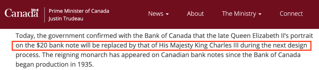 加拿大总理贾斯汀·特鲁多 (Justin Trudeau) 发布的新闻稿称,联邦政府已指示加拿大银行在下一个设计过程中将已故女王伊丽莎白二世的肖像替换为国王查尔斯三世。联邦政府还委托加拿大皇家铸币厂设计印有新君主形象的流通硬币。