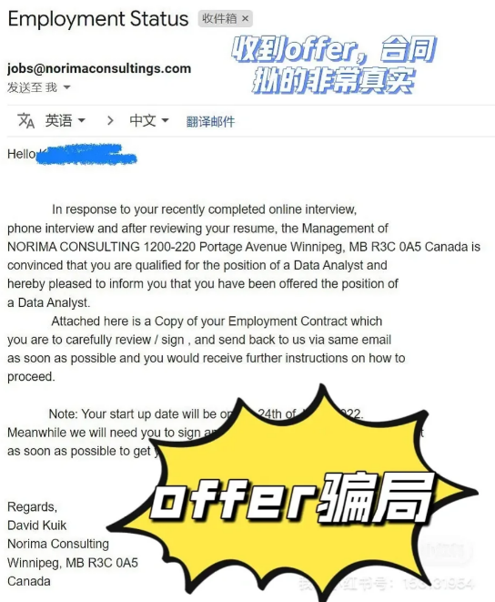 中国留学生遭高端杀猪盘:接到假实习offer,一个月被骗$8000刀!2023-05-08 |作者:加拿大留学生问吧 | 来源:温哥华头条加拿大华人温哥华头条Loading...分享:#加拿大#实习#诈骗 周围很多留学生朋友抱怨,在家全职找工作3个月了,投出200多份简历,眼看别人面试顺利接到offer,自己却石沉大海,心态也逐渐崩溃。 提醒大家越是这个时候大家越要沉得住气,因为不法分子就是利用求职者的焦虑和恐惧来掉入骗子们精心设计好的杀猪盘。 最近,一位华人留学生曝光了自己接到假offer,一个月内被诈骗$8000刀,即使报警也无法拿回的惨痛经历。 小红书网友向大家普及了利用虚假实习职位进行招聘的行骗手段,通常目的为身份盗窃进而进行金融诈骗。 首先诈骗团伙通常在linkdein或非正式jobboard开始发布虚假实习职位。这些公司可能是刚成立的,也可能是假扮某正规公司的名字,但使用一些“高仿”logo。职位和工作描述看起来很正规,包括具有特定的要求写的都很像样子,因为大多是直接复制粘贴的。 当学生对职位表达兴趣,骗子就会进行虚假面试的邀约,通常很久没拿到面试的同学会很高兴从而掉以轻心。这里开始,你就很有可能上套了,“recruiter”会通过电话或电子邮件进简短面试。骗子可能很快就恭喜你拿到offer。 “昨天才申请的岗位,第二天就告诉我被录取了,连个interview都没有。” “接到网上面试,电话面试,结果就收到offer了!难道不应该有三四轮面试吗?” 接到offer之后,骗子会立刻联系你,以看似合理的需要办理入职、购置办公设备或提前training为由,要求提供个人信息,如SIN卡、银行账户信息或其他敏感数据。 “公司暂时不能提供电脑要自己买,以后会给报销。要各种信息并引导去钓鱼网站购买电脑。” 这类诈骗相对而言比较好识破,主要暴露在面试的不完整性,通常以因为第一名接了别家的offer,现在你可以在三天内马上入职等等给你压迫感。 “正规公司不会要求实习生垫钱。” “自己买设备也是一眼假。” 另一种“支票诈骗”的手段就高明的多,更加难以辨认,他们承诺购置的一切办公设备是公司支付,轻易的打消了求职者的顾虑。骗子寄来Cheque要求先存入求职者账户,再转去指定商家购买电脑设备。 “我就遇到过,骗子给了我4000刀支票,我还兑换成功了,不过最后跳票,银行撤回扣了点手续费。” 不过别的同学就不那么幸运了,“因为之前确实显示在我的账户上,但当时不知道cheque存款到账户里需要几天审核。当发现支票跳票,所有转出的钱只能自己承担。而骗子早已跑路。” “警方介入也毫无进展,身份信息被盗窃后,各类银行账户被短期掏空。”不少留学生都称毫无办法,只能认栽。 据爆料网友透露,一些高端骗局,甚至不会自己开job post,而是看最近哪些大公司开了实习职位,自己通过linkdein的一些搜索,锁定大致可能会投递了该公司的同学,直接点入你们的个人网站比如作品集,找到简历上的邮件或电话,主动联系。 他们使用的邮箱看起来也会很专业,最丧心病狂的是他们甚至还会直接安排全套三轮假面试。面试官都会假装使用现任真实员工的linkdein或自己开设一个高仿linkdein,让整个过程看起来非常真实。最后可能会用docusign等文件假戏真做办理入职。 以上网友分享的真实经历,希望可以提醒各位同学,请不要让骗子轻易利用你的处境和焦虑,从而盗取你的个人信息造成不可挽回的财产损失。 阅读 未经允许不得转载:加拿大乐活网 »中国留学生遭高端杀猪盘:接到假实习offer,一个月被骗$8000刀!分享: