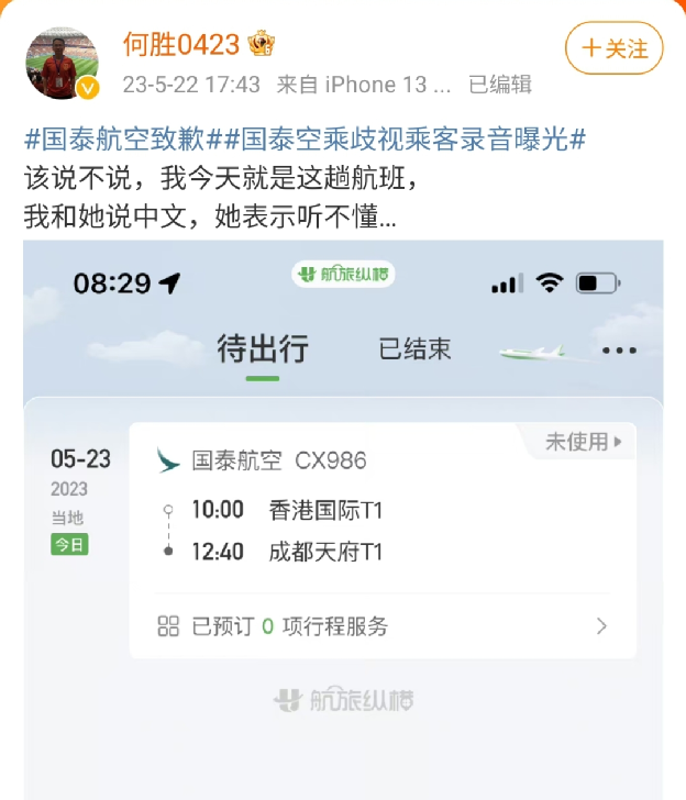 5月22日,一位华人网友在小红书上曝出,在他乘坐的国泰CX987成都飞香港的航班上,空乘不断用粤语、英语抱怨,歧视普通话乘客。