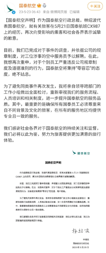 声明中,国泰航空表示三位涉事的空中服务员已经被解聘,对于个别员工严重违反公司规章制度及道德准则的行为,国泰航空将秉持“零容忍”的态度,绝不姑息。