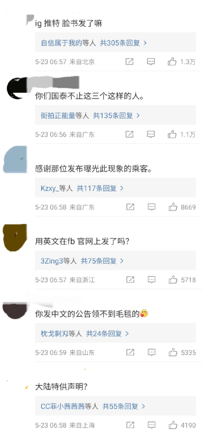 歧视事件还远不止这一起,5月22日,网红“退钱哥”在微博上曝出,自己在乘坐国泰航空CX986 香港-成都的航班时,和空乘人员说中文,对方直接表示听不懂。
