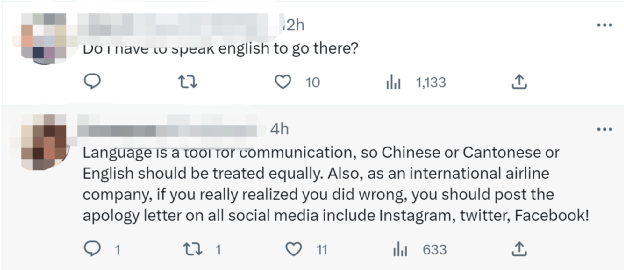 在推特上,也有网友发声表示:“语言只是用来沟通的工具。不管乘客说普通话还是粤语,都应该被同等对待。作为一家国际航空公司,如果你们真的意识到错误了,就应该把道歉信发在所有社交平台上,包括Instagram、Twitter和Facebook上。”