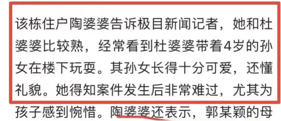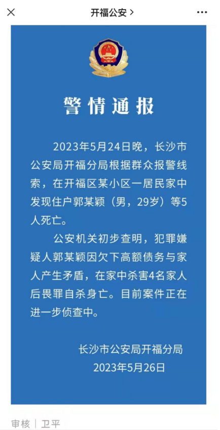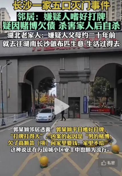 邻居透露,男子郭某颖疑似因赌博欠下巨债,面对高额的债款,他无力偿还,只能找家人要钱,但遭到家人的拒绝,产生矛盾,于是,他将老婆,孩子和父母全部杀害,最后畏罪自杀。