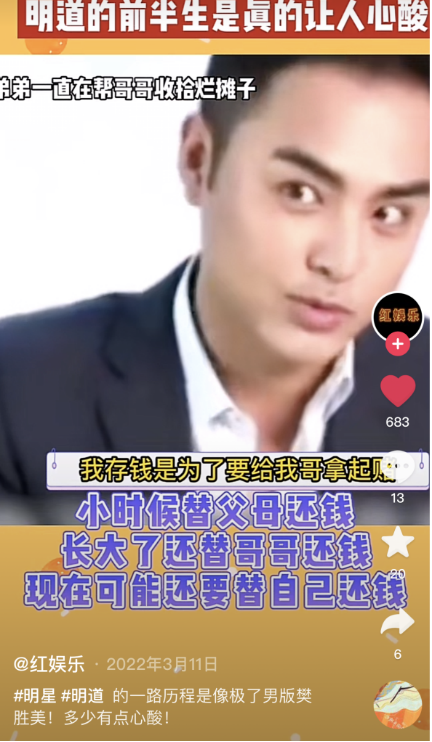2020年,男星明道的哥哥因赌博欠下巨款,无力偿还。