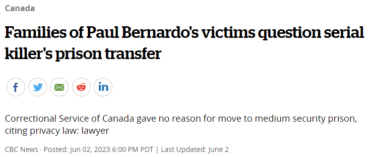 如今,“杀人狂魔”、“强奸重犯”保罗·贝尔纳多被从安大略省金斯敦的最高安全级别监狱,转移到魁省的中级安全级别监狱——正义的“来福灵们”,你们怎么看?