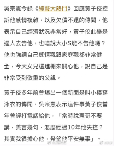 吴宗宪也否认了有关自己的爆料,在采访中表示“他这个不好好说话,就要去法院帮人家澄清了”,顺便爆料,多年前黄子佼曾求助自己,解决另一件性骚扰事件。