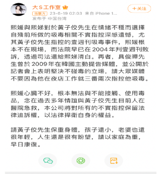 大小S方表示,自己心脏不好,不可能接触毒品!并希望黄子佼保重身体,祝早日康复!