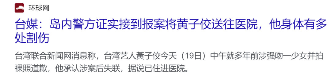 在道歉视频发布后,黄子佼因情绪不稳,试图割腕自杀!万幸在经过治疗后,已无生命危险,目前已苏醒。