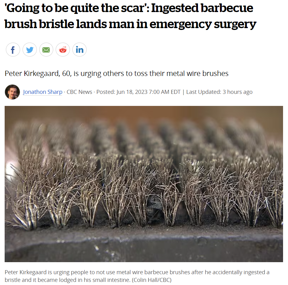 快扔掉!加拿大男子用了这个烧烤工具险没命,紧急开腹缝22针!2023-06-19 |作者:加国无忧 | 来源:温哥华头条加拿大温哥华头条Loading...分享:#烧烤钢刷 烧烤季来了,大家在选择工具时一定要注意,以防止在过程中发生意外。 上周,加拿大60岁老人彼得·基克加德(Peter Kirkegaard)在一次烧烤派对后,连续数日身体严重不适,连医生都无法确定他的问题所在。在他妻子的坚持下,医生对他进行了CT扫描。结果显示,基克加德的小肠内卡着一根小而细的物体。原来那是一根来清洁烧烤炉的钢丝刷刷毛。 事后,基克加德在接受采访时表示:“如果不是我的妻子,谁知道最后会发生什么?”他解释说,他相信那个金属碎片可能会导致他死亡。 图源:CBC 基克加德目前正在BC省Terrace的家中康复。他希望所有人扔掉钢丝刷,选择其他替代品。 他说:“千万不要再使用那些金属刷子。” 图源:Peter Kirkegaard 以为是食物中毒 基尔克加德的苦难始于他在烧烤派对上吃了一些烤鹿肉。第二天,即6月2日,他觉得自己好像食物中毒了,尽管参加烧烤的朋友们都没有生病。 连续三天呕吐和腹泻之后,他去了医院。医生怀疑是一种病毒感染,给了他止吐药并让他回家。 但是药物没有起到作用。基克加德仍然无法进食,所以两天后他又去了医院。 医生进行了血液检查,但没有发现任何值得关注的地方。他们再次给基克加德开了一些药并让他回家。 第二天早上,他的症状恶化,血压飙升,心率”疯狂加快”。 第三次去医院时,他的妻子坚持要求做CT扫描。尽管有些由于,医生还是听从了她的建议。随后,他们立即注意到基克加德小肠里有东西。 基克加德说:“它实际上紧贴着我的胰腺,很有可能造成更大的伤害。“ 医生首先试图通过基克加德的口腔取出断裂的钢丝,但没有成功。唯一的选择是进行开腹手术。 这次紧急手术在基克加德的腹部中间,留下了22根缝合钉。 “这将是一个相当大的疤痕,”基克加德说道。”但我也不再年轻了,所以无所谓了。” 图源:Peter Kirkegaard 基克加德原本计划在上周末庆祝他的60岁生日,但他不得不取消派对以便康复。 当他的朋友们在得知他进手术台的原因后,许多人纷纷扔掉了自己的钢丝刷。 最近更新的安全标准 2020年,加拿大为烧烤炉刷制定了国家安全标准。这一标准要求在金属毛刷上贴有警告标签,并进行测试以降低金属丝脱落并被误食的风险。 该标准是在加拿大卫生部收到数十起安全报告后发布的,在2014年至2020年期间,有近50起涉及钢丝刷受伤。 其中6起受伤事件涉及钢丝刷进入人体肠道,就像基克加德的情况一样。大约一半的伤害是由于金属刷毛进入人的口腔或喉咙引起的。 虽然一些人呼吁禁止使用钢丝刷,但加拿大卫生部决定不采取这种做法,而是制定了这一标准。 图源:Peter Kirkegaard 为了安全起见,大家在清理烧烤炉时尽量选择一些可替代的产品,比如尼龙刷子、植物纤维刷子、木质刮板和不锈钢螺旋刷。 阅读 未经允许不得转载:加拿大乐活网 »快扔掉!加拿大男子用了这个烧烤工具险没命,紧急开腹缝22针!分享: