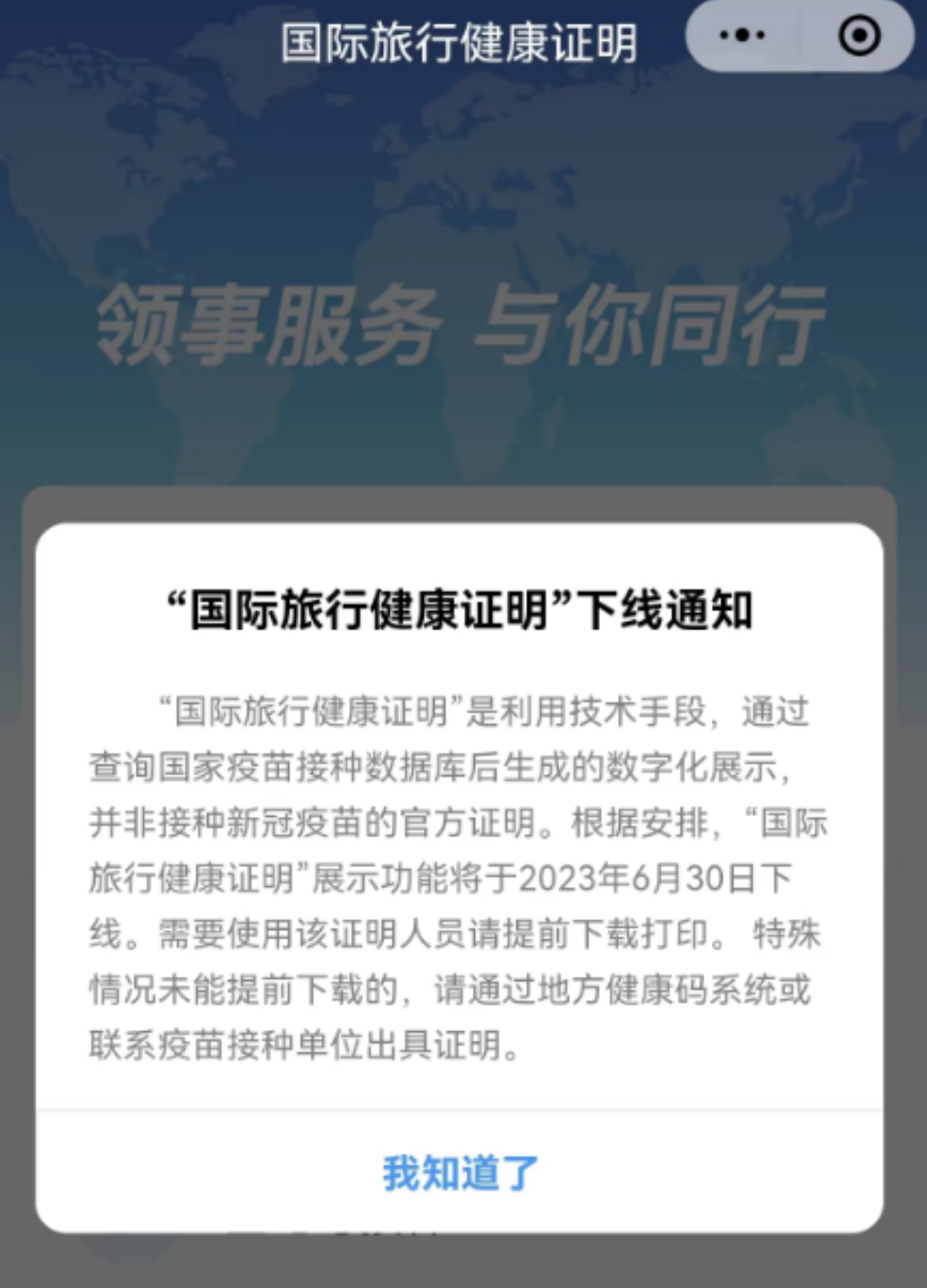 通知说,根据安排,“国际旅行健康证明”展示功能将于2023年6月30日下线。需要使用该证明人员请提前下载打印,特殊情况未能提前下载的,请通过地方健康码系统或联系疫苗接种单位出具证明。