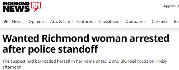 原来,据列治文警方表示,当天下午,他们先是接到了报警。报警人称,自己受到了一名女子的威胁。此后,警方出警前往现场了解情况。