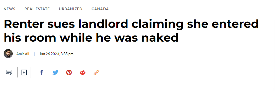 加拿大一名租客和房东之间的激烈矛盾最终闹到了法庭上,这其中还包括一些有点奇怪的索赔内容,比如,房客称,这名女房东在自己赤身裸体的情况下闯入了他的卧室,还拿出了证据。