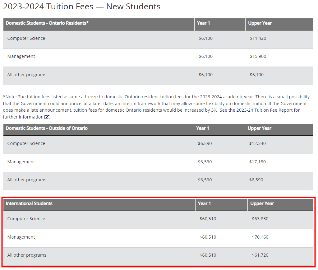加拿大Top大学曝6位数”天价学费”:留学生仅30%获得PR!2023-07-05 |作者:加拿大留学生问吧 | 来源:温哥华头条加拿大温哥华头条留学分享:#多伦多大学#学费今天,有人一睁眼就收到了六位数的巨额学费账单!!! 一位多伦多大学的留学生在Reddit论坛发帖称,Acorn账户里的待缴学费余额一夜之间从$0变成了$159,886。 不过,这位发帖的同学没有透露自己是什么专业的。虽然多大的学费早已是出了名的贵,但一年将近$16万的学费并不常见!网友们都纷纷表示好奇: “你读的什么专业?必须确保我自己别读那个!” “我就想知道到底什么学位一年要花这么多钱!” “我听过用留学生的学费补贴本地学生的说法,但这有点荒唐了。” “我不知道有哪个国际学位一年的学费会接近这个数字(尽管留学生的学费比本地学生高很多),这一定是个错误。” 然而,截至发文前,发帖的同学并没有现身回复大伙的疑问。 根据多伦多大学官网的学费公示,留学生本科生一年的学费并没有到$16万那么离谱,大约在$6万左右。2023-2024学年留学生热门专业的学费如下: 计算机科学、管理学和其他专业入学第一年学费$60,510,大约是本地学生($6,100 )的10倍。 计算机科学第二年的学费涨至$63,830,大约是本地学生($11,420 )的5.6倍。 管理学第二年的学费涨至$70,160,大约是本地学生($15,900 )的4.4倍。 其他专业第二年的学费略涨至$61,720,是本地学生($6,100 )的10倍。 除了学费之外,还有一些其他费用,比如住宿费、伙食费、医疗保险费等等。具体的费用如下: 合作实习项目:$980-$2,888 Centennial College学院联合课程:$40-$194 杂费/附加费:$1,979 学校宿舍:$7,490-$14,960 膳食计划:$5,795-$6,095 课本和学校用品:$1,000-$2,000 大学医疗保险(UHIP):$756 这么算下来,多大留学生每年在学费+生活费上花费超过$10万似乎非常正常。 然而,尽管留学生付着比本地学生高出4-10倍的学费,但他们在专业领域就业和毕业后留在加拿大时却面临许多挑战。 加拿大BC省最近针对1,282名国际留学生进行的一项调查发现,绝大多数学生打算留在加拿大。他们将学生签证视为获得加拿大枫叶卡(PR)和公民身份的途径,但事实上,他们的就业机会有限,最终只能从事低薪工作,并面临高昂的生活成本。而政府提供的支持非常少。 加拿大统计局的数据显示,只有30%的拥有学士学位的留学生在第一次学签后的10年内成功获得PR身份。 那些完成硕士或博士课程的人,获得PR的几率分别为50%和60%。 研究人员发现,大专院校更注重招收学生,而不是确保他们的成功。 调查结果指出,“在严重依赖临时工的加拿大经济中”,国际学生已经成为一个新的临时外国工人群体,但在他们选择的学习领域没有足够的就业途径。 报道称,虽然这个研究项目的重点是BC省,但加拿大各地的国际学生面临着类似的挑战。 太辛酸了! 阅读 未经允许不得转载:加拿大乐活网 »加拿大Top大学曝6位数”天价学费”:留学生仅30%获得PR!分享:
