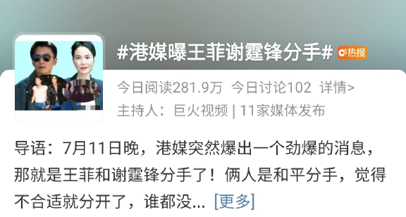 然而,近来据港媒消息透露历经九年,这二位近日又被传出已然“和平分手”的消息了!这消息一出,昔日顶流威力不减,立刻登上了微博热搜,发布当天竟然有4.3亿的阅读量。
