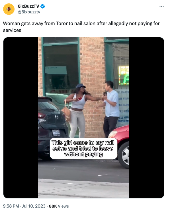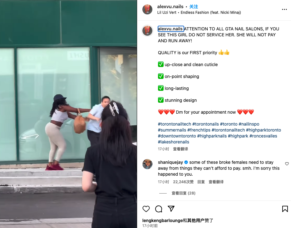 多伦多一家美甲店的老板呼吁公众帮助追踪一名女子,这名女子不仅没有支付美甲费用就离开了,而且在他试图以“白嫖”服务为由追她时,被该女子多次殴打。