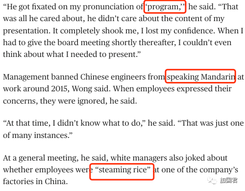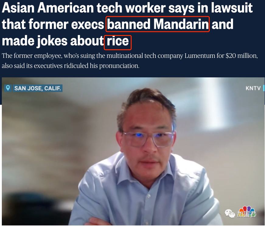 禁说普通话,讥笑蒸米饭!加拿大华裔博士受够白人歧视,索赔$2000w2023-07-18 |作者:超级生活 | 来源:温哥华头条华人温哥华头条美国分享:#华人#美国#诉讼加拿大一名华裔博士近日起诉所在的高科技公司,索赔$2000万,称公司文化非常歧视,禁止说普通话,还讥笑蒸米饭,结果因公开谈论对亚裔歧视而被解雇。 黄博士(Andre Wong)在加拿大长大,大学本科在加东的达尔豪斯大学(Dalhousie University)获得学士学位,然后到加西卑诗大学UBC攻读博士,获得材料物理学博士学位(Materials Physics)。图源:NBC News 2023年7月12日 随后,Wong以加拿大自然科学与工程研究委员会(NSERC)学者身份,到加州大学伯克利分校担任博士后研究员,研究使用 CMOS 传感器制造低光子计数探测器 。 Wong 博士过去20多一直在硅谷 Lumentum科技公司工作,任3D传感产品线管理副总裁(Vice President)。图源:Linkedin 6 月 30 日,现年52 岁的 Andre Wong 向当地高等法院提起诉讼,要求赔偿 2000 万美元。 Andre Wong表示,他在Lumentum工作了20年,在那段时间里,他多次被排除在适合他的管理职位之外。 他的律师表示,这起案件不仅仅是关于一个人,而是关于硅谷对亚裔的工作场所歧视。 在他的诉讼中,提出很多海外华裔工作者的担忧,即公司存在所谓“竹子天花板”(bamboo ceiling),一种无形的升职障碍,阻碍了亚裔晋升到高层领导职位。 黄博士声称,在 Lumentum 工作的二十年里,他看到管理层禁止在办公室非正式场合讲普通话,他因发音 R 的方式而受到嘲笑,并被告知公开谈论种族主义“让白人感觉很糟糕”,最后,他被放弃负责监督他创造的技术的高管职位。 他在诉讼称,他被解雇的直接原因是他公开谈论他所经历和观察到的亚裔人在工作场所受到的歧视。 “我的首要目标是推动行业变革,”黄说。“有很多故事没有被讲述,人们担心遭到打击报复。” 跨国电信设备公司 Lumentum 没有回应NBC置评请求。图源:Fox News 2023年7月10日 根据NBC报道,Wong 是一位出生于加拿大的美国华裔,在去年 12 月被解雇之前,他已在 Lumentum 工作了 22 年。他说,当他在那里时,他开发了一种 3D 传感技术,诉讼称该技术为公司带来了 10 亿元的收入。 但黄博士说,尽管他是该计划的先驱,但他被剥夺了监督该计划的高管职位,反而受到白人经理的旋转门影响。 “我必须培训这些白人经理并将其介绍给我的行业联系人,这本身就让我感到非常沮丧,”他说。 “我感觉自己正在用头撞门,心想:‘我需要做什么?’” Lumentum 网站上的 2021 年简历将 Wong 描述为“在实现 Lumentum 在 3D 传感领域的领导地位方面发挥了重要作用”。但他觉得公司从未被认真考虑过升他职。相反,当 2020 年招聘高管职位时,考虑了两名外部候选人:一名南亚裔男性和一名白人女性。 诉讼称:“面试过程结束后,管理层告诉团队,白人女性更受欢迎,因为她‘不像我们’。” 但黄博士表示,这并不是他在公司经历的第一次或最明显的歧视事件。 起诉书称,有一次,当他准备一场董事会会议的演讲时,一位白人高管嘲笑他英文 R 发音的方式,让他发音清楚。黄先生表示,这对他影响很大。 “他很关注我对‘program’单词的R发音,”他说。 “这就是他所关心的,他并不关心我演讲的内容。这彻底震撼了我,我失去了信心。此后不久,当我在董事会会议时,我甚至无法考虑我需要展示什么。” 黄博士说,管理层在 2015 年左右禁止中国工程师在工作中说普通话。他说,当员工表达他们的担忧时,他们被忽视了。 “当时,我不知道该怎么办,”他说。“这只是众多例子之一。” 他说,当一家中国工厂的某个区域的产品出现故障时,一位白人高级管理人员在一次股东大会上问道:“他们在生产车间的那个区域“蒸米饭”吗?” 他说,在乔治·弗洛伊德被跪杀和亚特兰大水疗中心枪击事件发生后,全公司范围内有关种族的讨论促使他与亚裔同事建立了联系。 黄博士发现他们都有相似的经历,于是,2021年,他成立了一个亚裔员工资源小组。 该小组获得的人口统计数据显示,虽然 Lumentum 在美国60% 是亚裔人,但高管人员大多是白人,其中亚裔比例不到 15%。 他说,亚裔员工小组了向公司所有人开放的活动,其中包括一次在Asian ERG 演讲,他分享了个人遭受歧视的故事。 根据 NBC 新闻获得的一份演示文稿副本,其中一张幻灯片还促使管理层聘用一定比例的亚洲员工担任更高级别的职位。 他说,后来高层管理人员告诉他,这次演讲“让白人感觉很糟糕”。 在接下来的一年里,他继续为亚裔发声,并于 2022 年 5 月被迫辞去 3D 传感团队的工作并重新分配新职位。 在担任新职务后,他继续倡导反对他认为的歧视文化,七个月,2022年12月,但他被Lumentum解雇了。 虽然 Wong 在针对 Lumentum 的诉讼中处于风浪前沿,但他表示,这些故事在整个科技行业都有所反映,在针对硅谷公司的诉讼中越来越多地出现。 Wong 起诉 Lumentum,要求赔偿 2000 万美元。他说,如果他获胜,他计划将大部分赔偿金额捐献给反亚裔歧视运动。 他的律师Charles Jung表示,他希望这是一场反亚裔歧视运动的开始。 “我们的目标不仅仅是实现某个案例的改变,而是实现整个行业的改变,”律师说。 “ 我认为这一系列案例反映出,亚裔美国人已经受够了被视为二等公民,他们通常被视为有技术或有能力,适合工厂车间干活,但不适合担任领导一个公司的职务。” 黄博士现在受够了,不再沉默,向反亚裔歧视提出诉
