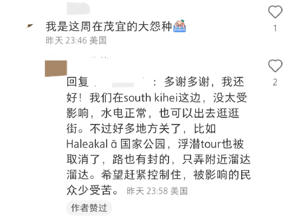 被困的旅客中,也有华人朋友的身影。有华人网友在小红书等社交媒体上称,自己本周不幸滞留在了Maui岛,但所在区域没又受到太大的影响,还能出去逛逛街。许多景点和项目都关闭了,路也封了。