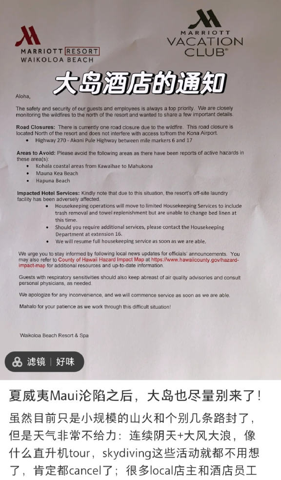 也有在隔壁大岛的朋友接到酒店通知,由于小规模山火,岛上的部分道路被封,几个景区有危险请勿进入。