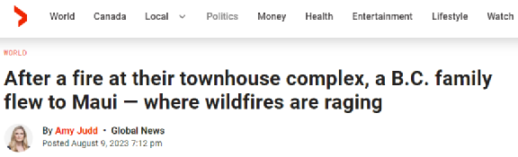 不过,这还不是最魔幻的。大温的这一家人才是真的倒霉。8月8日早上,这家人在Port Moody的联排别墅前刚刚失火,四个单元被烧。火灾后气味儿很臭,这家人想着干脆借机出门度假一周,于是订上了去茂宜岛的航班。