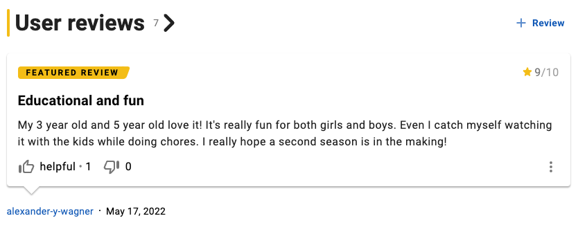 比如下面这个评论,说这部动画片太有教育意义了,而且还特别有趣,她两个孩子,一个3岁,一个5岁,都能看得津津有味,而且动画片的内容男孩女孩都很喜欢!