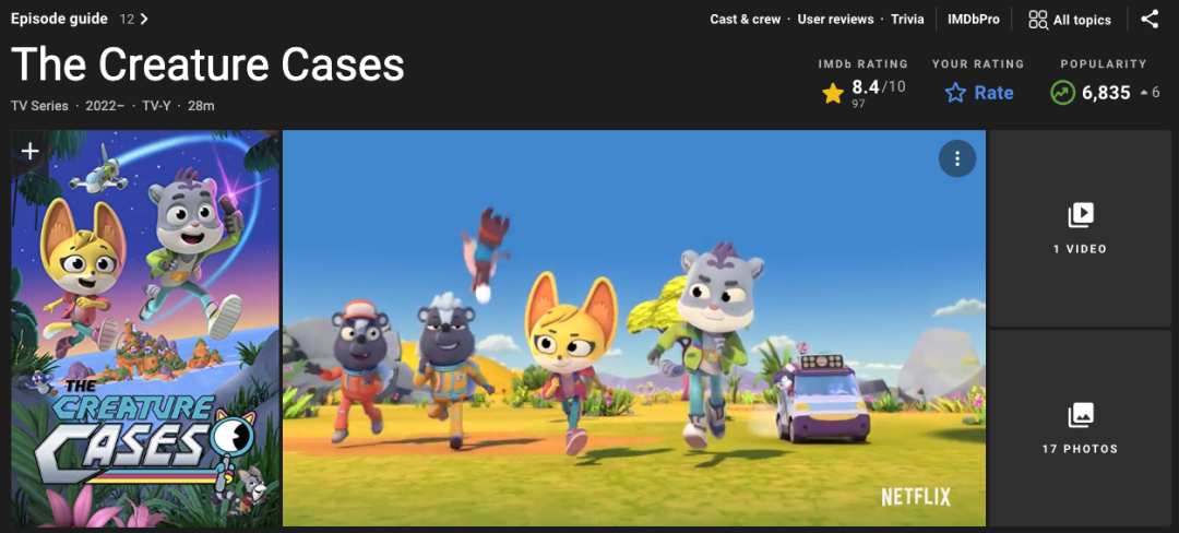 晚上我就在网上搜,突然我的浏览器跳出了一部动画片,叫做《The Creature Cases》,中文名叫做《动物神探队》。