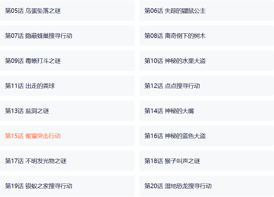 下面这个就是里面的部分剧集,你看那些剧集的名字,什么“失踪的鼹鼠公主”、“神秘的水果大盗”、“不明发光物之谜”等等,光是看名字,就吊足了孩子的胃口!